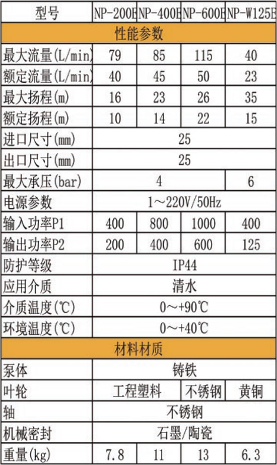 保证水泵长时间不生锈;叶轮设计先进,采用优质PPO(NP-W125E叶轮材质为黄铜)精制而成,运行平稳。配用原装进口国际名牌机械密封及轴承,保证产品品质。电机配装过热保护器,运转安全。外型设计紧凑精巧,便于安装、运输。